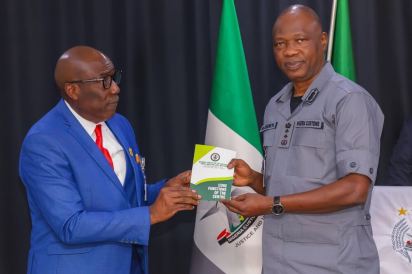 From right: Comptroller General of Customs, Bashir Adewale Adeniyi receives a security hand book from the coordinator of NCCSALW, retired Police DIG Babatunde Kokumo during the visit.